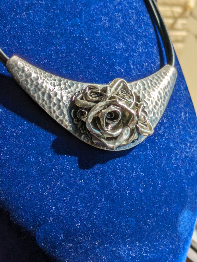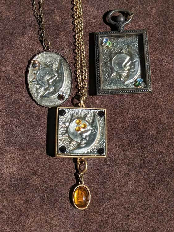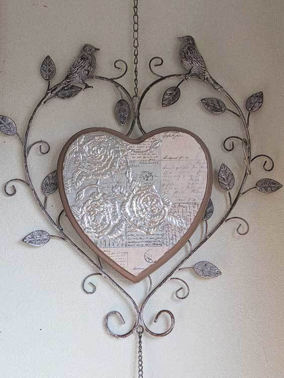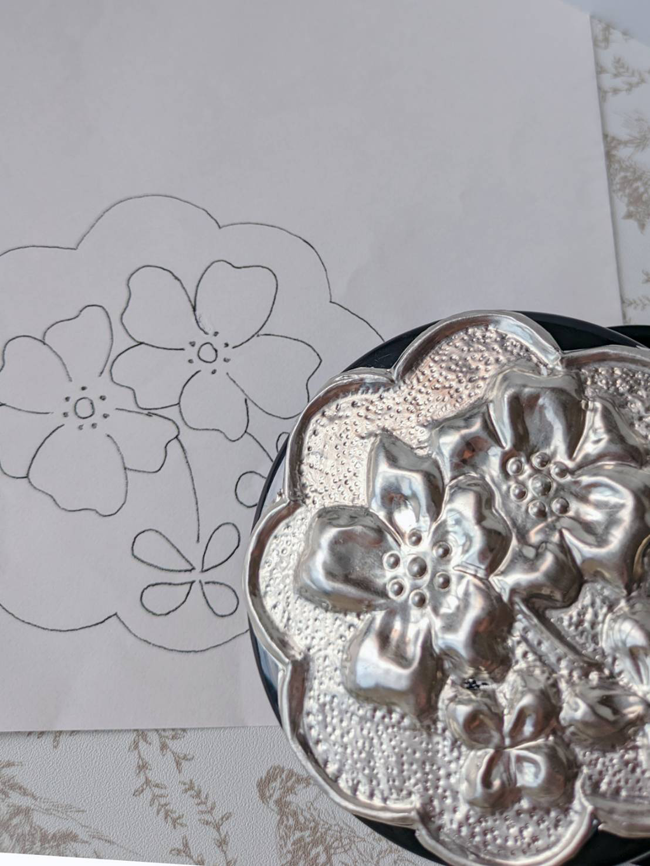 モノクロームの銀色に耀く素材のピューター(錫93%の合金で安全性が高い)に、専用の工具を用い、裏表にエンボッシングして、装飾的な模様を施して作品を仕上げます。力の入れ方で浮き彫りされた繊細なデザインが、不思議な光沢と輝きをみせてくれます。ゴージャスな雰囲気に魅了されます。